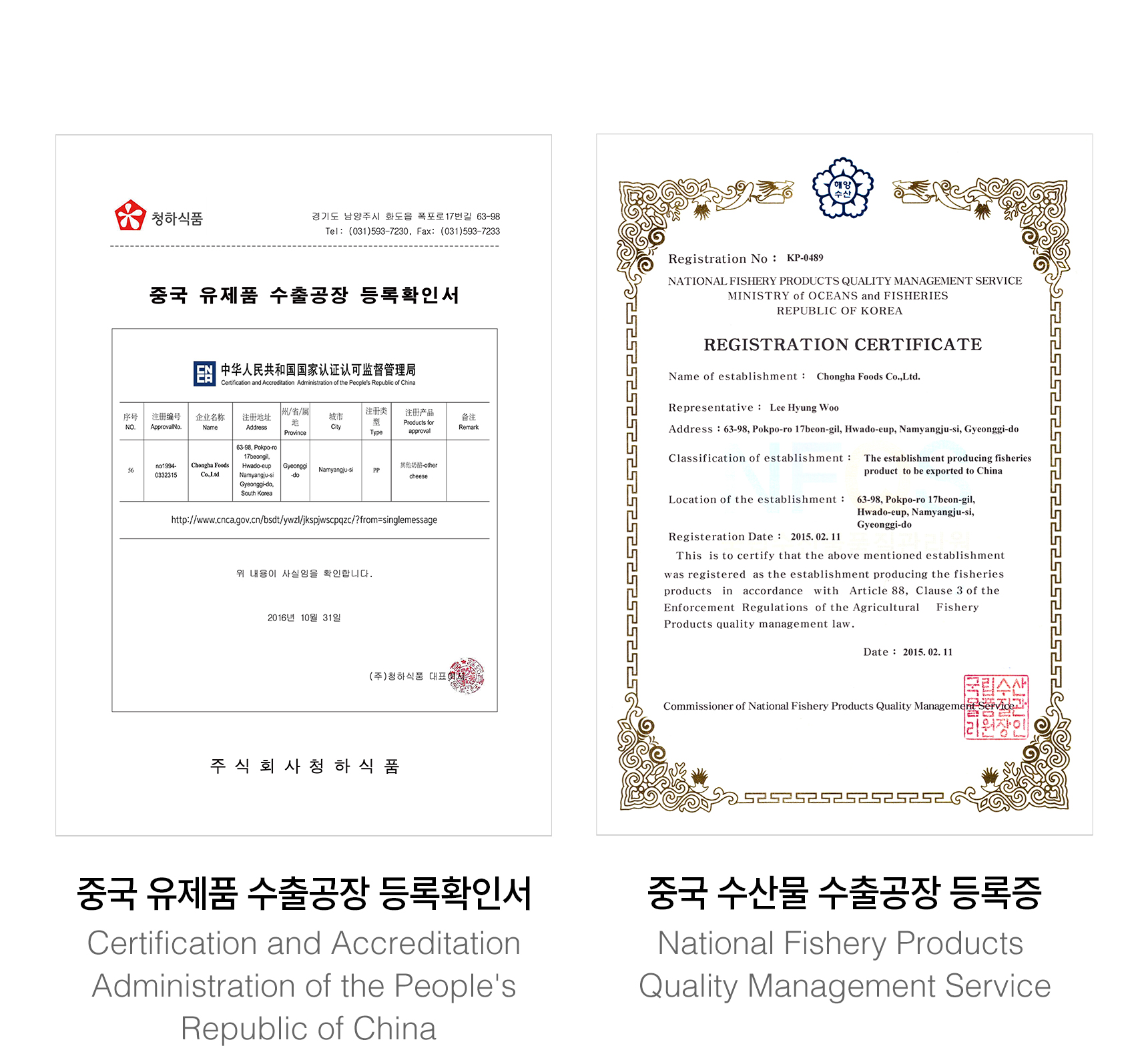 Chongha started exporting our products to Japan and Russia at the beginning of establishment. Since then, we have been constantly striving to enter overseas markets. As a result, it is registered as a factory for exporting dairy products and aquatic products in China, and signed an MOU with 'Yili Group’ in 2016. Now, we are expanding our business to China, USA and Hong Kong.